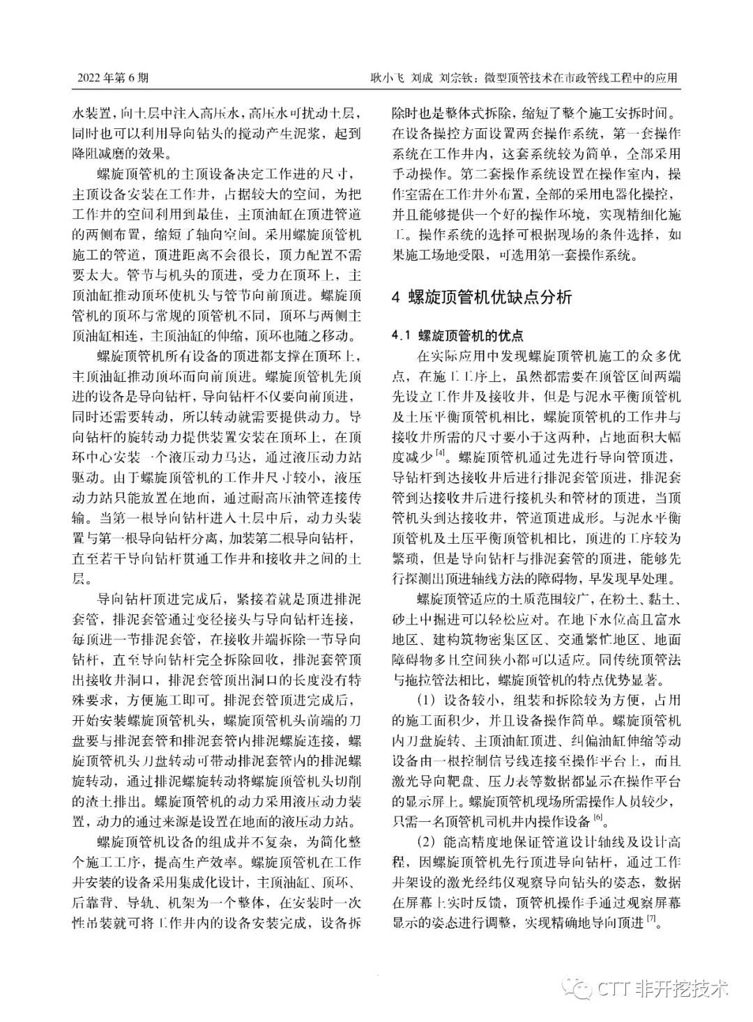 摘要:針對(duì)小口徑管道敷設(shè)中不宜采用開挖施工和拖拉管施工的問題,本文提出一種適用于小口徑管道非開挖施工的微型頂管施工設(shè)備,介紹該設(shè)備的工藝原理,分析設(shè)備的優(yōu)缺點(diǎn),研究微型頂管設(shè)備在小口徑管道施工關(guān)鍵技術(shù)及施工成本,為小口徑管道非開挖施工提供可借鑒經(jīng)驗(yàn)。關(guān)鍵詞:小口徑管道; 微型頂管; 工藝原理; 關(guān)鍵技術(shù)結(jié)論:在市政管線小口徑管道建設(shè)工程中,螺旋頂管機(jī)在小口徑管道施工中的應(yīng)用,解決了在房屋建筑密集區(qū)的街巷及作業(yè)面狹小的區(qū)域管道鋪設(shè)。螺旋頂管機(jī)具有其他傳統(tǒng)的施工方式無法比擬的優(yōu)勢(shì)--施工速度快、精度高、工作面小、對(duì)交通及周邊建構(gòu)筑物擾動(dòng)及地面的隆起與下沉影響較小。由于其所需作業(yè)面小,能夠降低工程造價(jià),經(jīng)濟(jì)效益較好,也為日后復(fù)雜工況下的小口徑管道施工提供了一種新型可靠的施工方式選擇。隨著市政管線村鎮(zhèn)化建設(shè)***推廣,螺旋頂管機(jī)所突顯出的優(yōu)勢(shì)會(huì)逐漸被關(guān)注,在市政污水工程上具有廣闊的應(yīng)用前景。