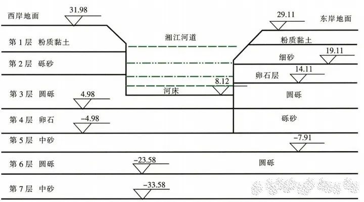 擬穿越湘江河段勘察深度范圍內(nèi)工程地質(zhì)剖面見下圖,圖中標(biāo)高單位為m。該地質(zhì)對(duì)水平定向鉆穿越適宜性較差。