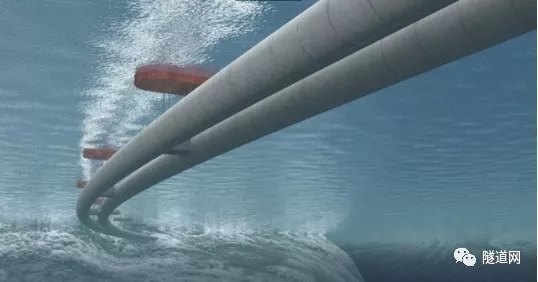 該隧道是將鋼筋混凝土的浮管懸掛在鋼制浮舟上構(gòu)成的。浮管平面線形為一段直徑 2682m的圓弧,圓弧中心線的長度為 4083m。隧道長度比普通水下隧道短,它不需要上下引道,通過4.1km長的挪威雙管式SFT只需不到10分鐘的時間。