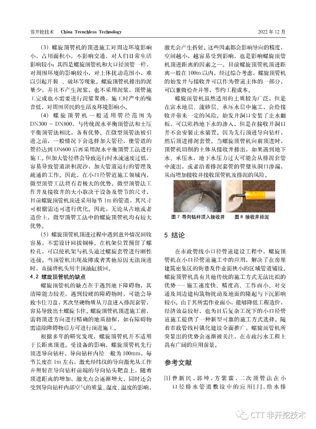 摘要:針對(duì)小口徑管道敷設(shè)中不宜采用開挖施工和拖拉管施工的問題,本文提出一種適用于小口徑管道非開挖施工的微型頂管施工設(shè)備,介紹該設(shè)備的工藝原理,分析設(shè)備的優(yōu)缺點(diǎn),研究微型頂管設(shè)備在小口徑管道施工關(guān)鍵技術(shù)及施工成本,為小口徑管道非開挖施工提供可借鑒經(jīng)驗(yàn)。關(guān)鍵詞:小口徑管道; 微型頂管; 工藝原理; 關(guān)鍵技術(shù)結(jié)論:在市政管線小口徑管道建設(shè)工程中,螺旋頂管機(jī)在小口徑管道施工中的應(yīng)用,解決了在房屋建筑密集區(qū)的街巷及作業(yè)面狹小的區(qū)域管道鋪設(shè)。螺旋頂管機(jī)具有其他傳統(tǒng)的施工方式無法比擬的優(yōu)勢(shì)--施工速度快、精度高、工作面小、對(duì)交通及周邊建構(gòu)筑物擾動(dòng)及地面的隆起與下沉影響較小。由于其所需作業(yè)面小,能夠降低工程造價(jià),經(jīng)濟(jì)效益較好,也為日后復(fù)雜工況下的小口徑管道施工提供了一種新型可靠的施工方式選擇。隨著市政管線村鎮(zhèn)化建設(shè)***推廣,螺旋頂管機(jī)所突顯出的優(yōu)勢(shì)會(huì)逐漸被關(guān)注,在市政污水工程上具有廣闊的應(yīng)用前景。