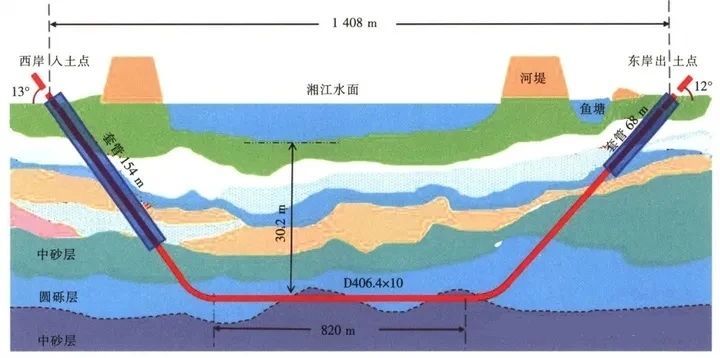 某輸氣管道在湖南省境內(nèi)穿越湘江,湘江河面寬約1090m。輸氣管道公稱直徑為400mm,設(shè)計(jì)壓力為4.0MPa,定向鉆穿越水平長(zhǎng)度為1408m,管道穿越深度位于河床以下30~40m。
